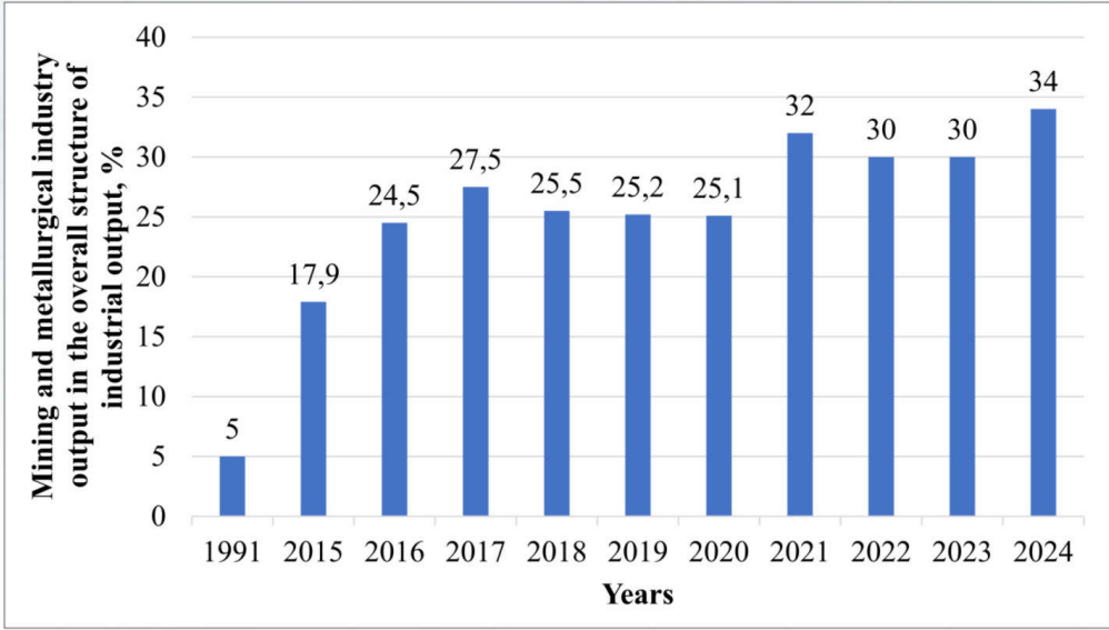• Figure 2: Mining and metallurgical industry output in the overall structure of industrial output, % (1991: 5% to 2024: 34%)