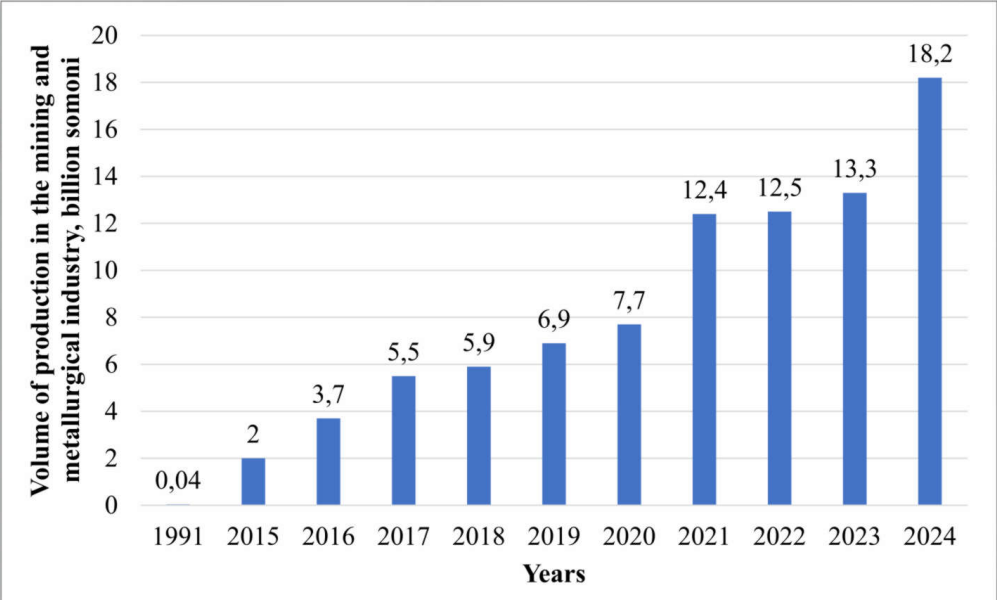 • Figure 3: Dynamics of change in the volume of production of the mining and metallurgical industry (1991: 0.04 billion somoni to 2024: 18.2 billion somoni)